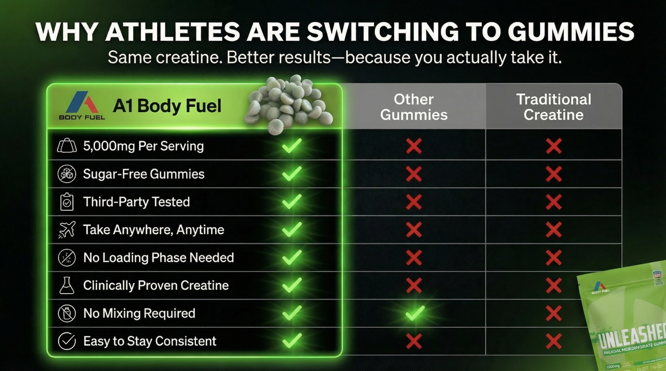 Not all creatine products are created equal. Unleashed Creatine Gummies deliver: